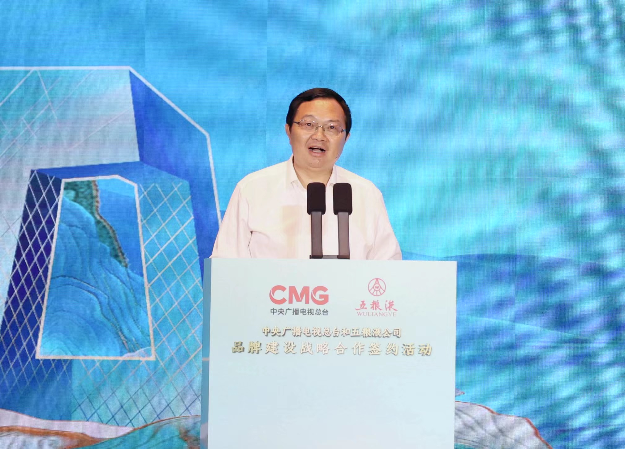 中央广播电视总台编务会议成员兼总经理室总经理彭健明,宜宾市委书记方存好,宜宾市委副书记、市长廖文彬,五粮液集团(股份)公司党委书记、董事长曾从钦出席活动,并与宜宾市委常委、宣传部部长雷涛,央视国际网络有限公司党委书记、董事长、央视频融媒体发展有限公司总经理过彤,总台四川总站副召集人郑直,五粮液集团(股份)公司党委副书记肖浩共同见证双方签约。