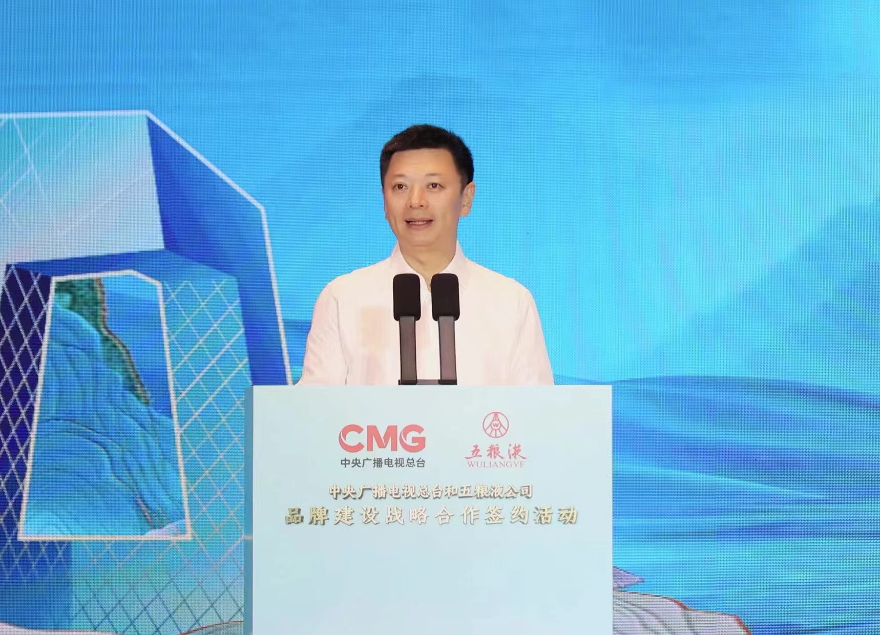 中央广播电视总台编务会议成员兼总经理室总经理彭健明,宜宾市委书记方存好,宜宾市委副书记、市长廖文彬,五粮液集团(股份)公司党委书记、董事长曾从钦出席活动,并与宜宾市委常委、宣传部部长雷涛,央视国际网络有限公司党委书记、董事长、央视频融媒体发展有限公司总经理过彤,总台四川总站副召集人郑直,五粮液集团(股份)公司党委副书记肖浩共同见证双方签约。